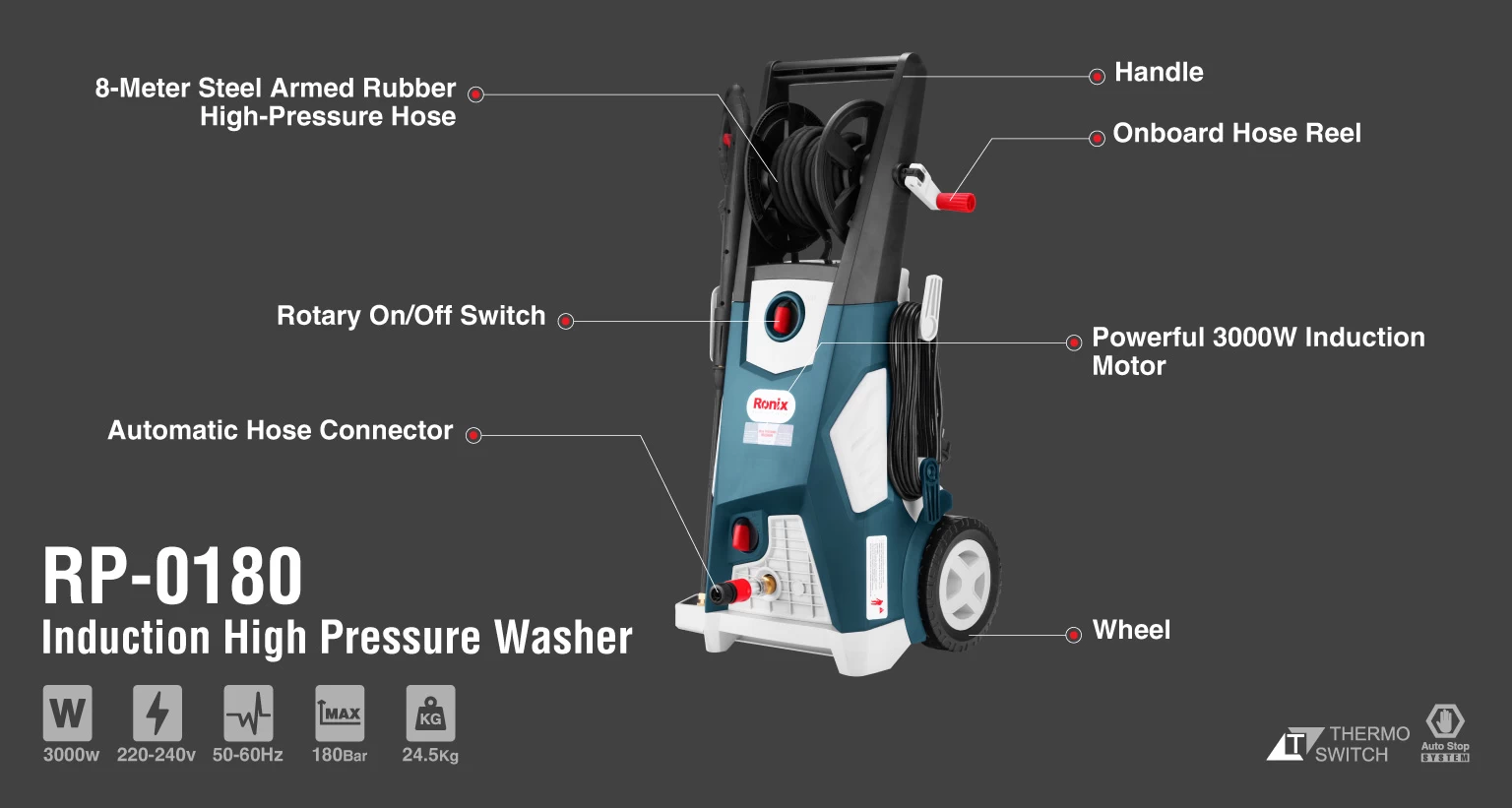 کارواش 180 بار دینامی رونیکس مدل RP-0180 به یک موتور اینداکشن تماممسی مجهز است که با توان 3000 وات کار میکند. این دستگاه دستیابی به حداکثر فشار آب خروجی 180 بار و حداکثر جریان آب 9.2 لیتر در دقیقه را امکانپذیر میکند. همچنین، به عنوان یک کارواش صنعتی برای فعالیتهای سنگین مانند لایهبرداری، زنگزدایی، رسوبزدایی، حذف رنگهای قدیمی و آلودگیهای چرب و روغنی در کارگاهها و کارخانهها مورد استفاده قرار میگیرد.