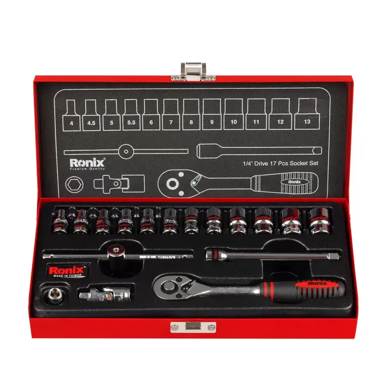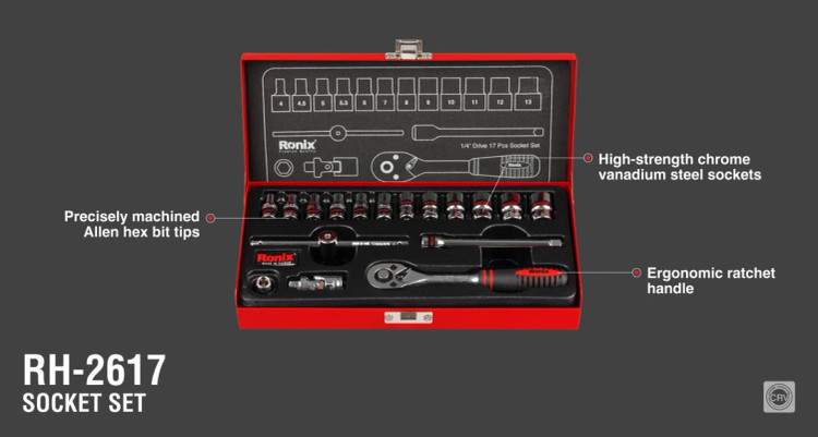 جعبه بکس RH-2617 رونیکس متشکل از 17 قطعه متفاوت شامل آچار، سری و دسته با سایز درایو 1/4 اینچ است.