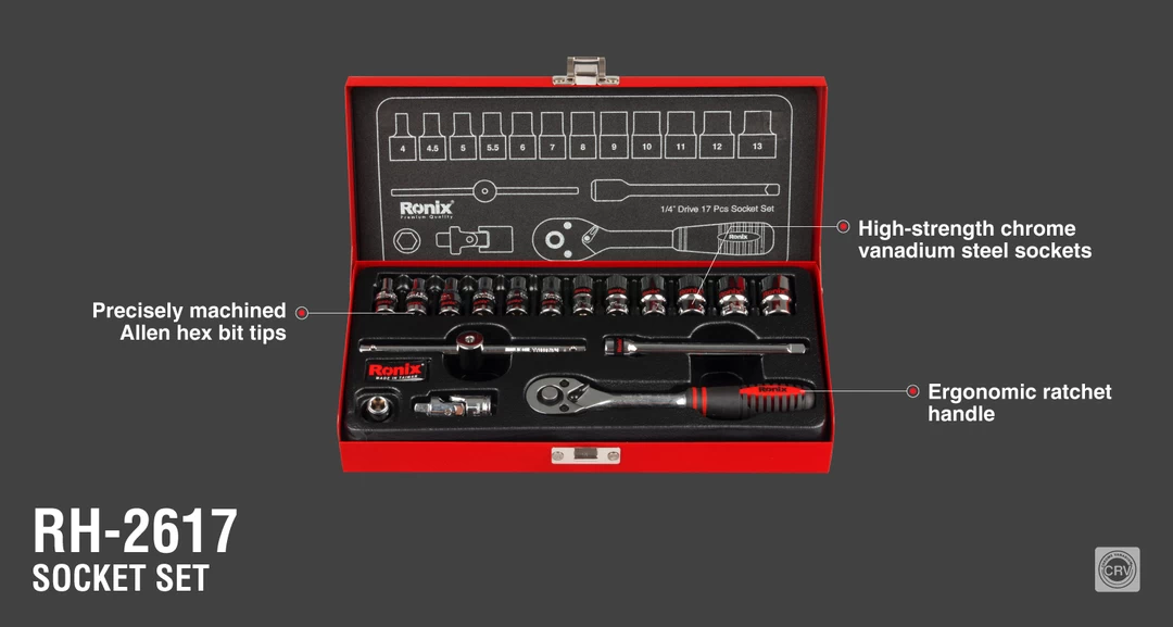 بدنه تمام قطعات جعبه بکس 17 عددی 1/4 اینچ رونیکس مدل RH-2617 از آلیاژ کروم وانادیوم ساخته شده و با کروم روکش شده تا حالت شفاف و آینهای پیدا کند.
